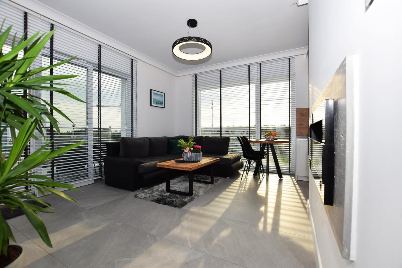 Oferta apartamentu obejmuje sypialnię (1), salon, aneks kuchenny z pełnym wyposażeniem, w tym lodówką i ekspresem do kawy, a także łazienkę (1) z prysznicem oraz suszarką do włosów. W apartamencie zapewniono ręczniki i pościel.
