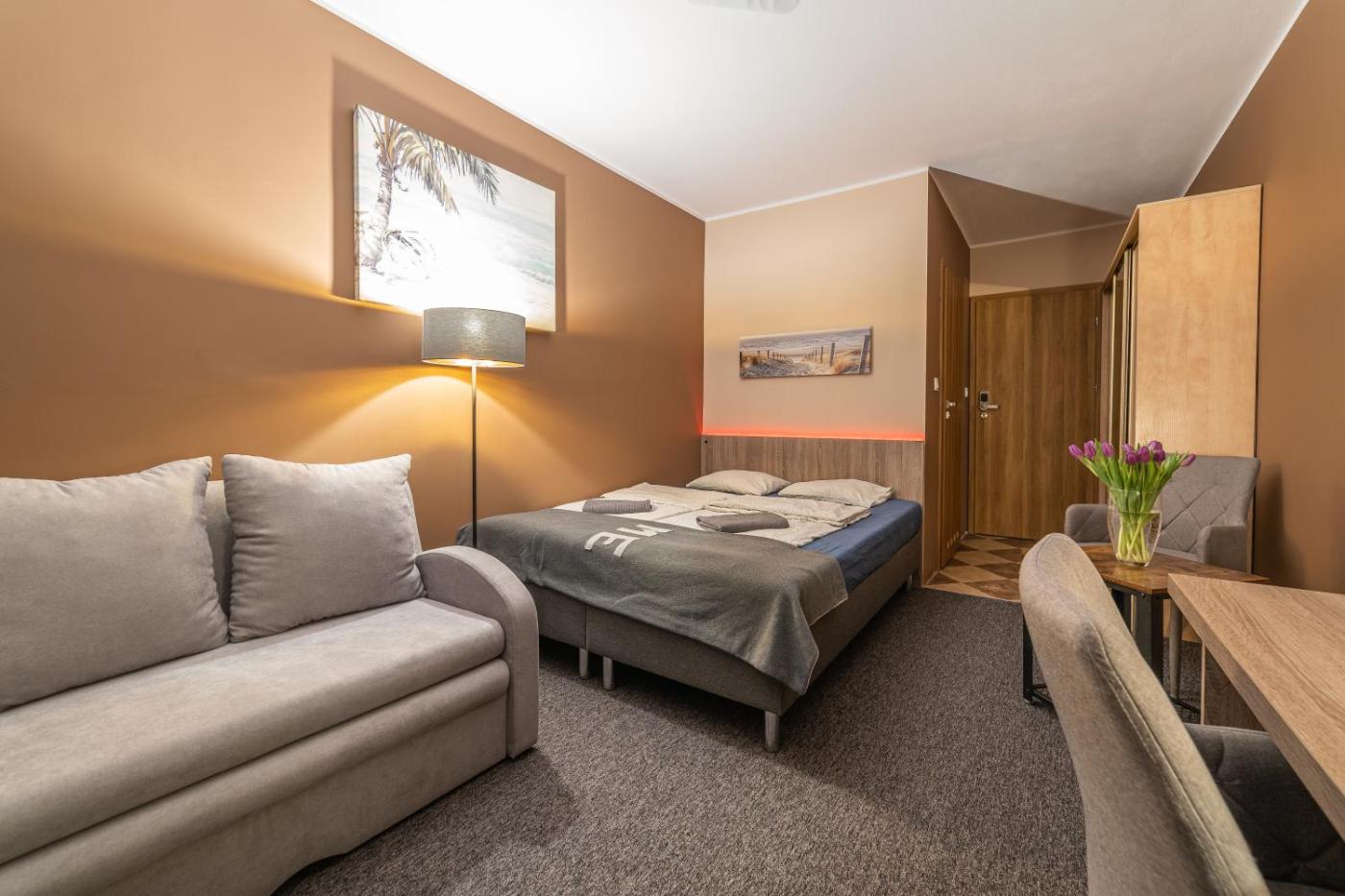 Wszystkie pokoje mają podłogi wyłożone parkietem. Znajduje się w nich część wypoczynkowa z telewizorem z płaskim ekranem, w pełni wyposażona kuchnia z jadalnią oraz łazienka. Do dyspozycji Gości jest także kuchenka mikrofalowa, lodówka, płyta kuchenna i czajnik.